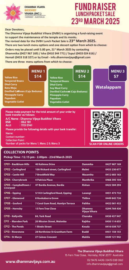 The Dhamma Vijaya Buddhist Vihara is maintained by the generous contributions made by its Devotees. These meritorious donations assist with the upkeep and day to day expenses of the temple. Your continuous support ensures that the temple meets its objectives in providing a service to the community.